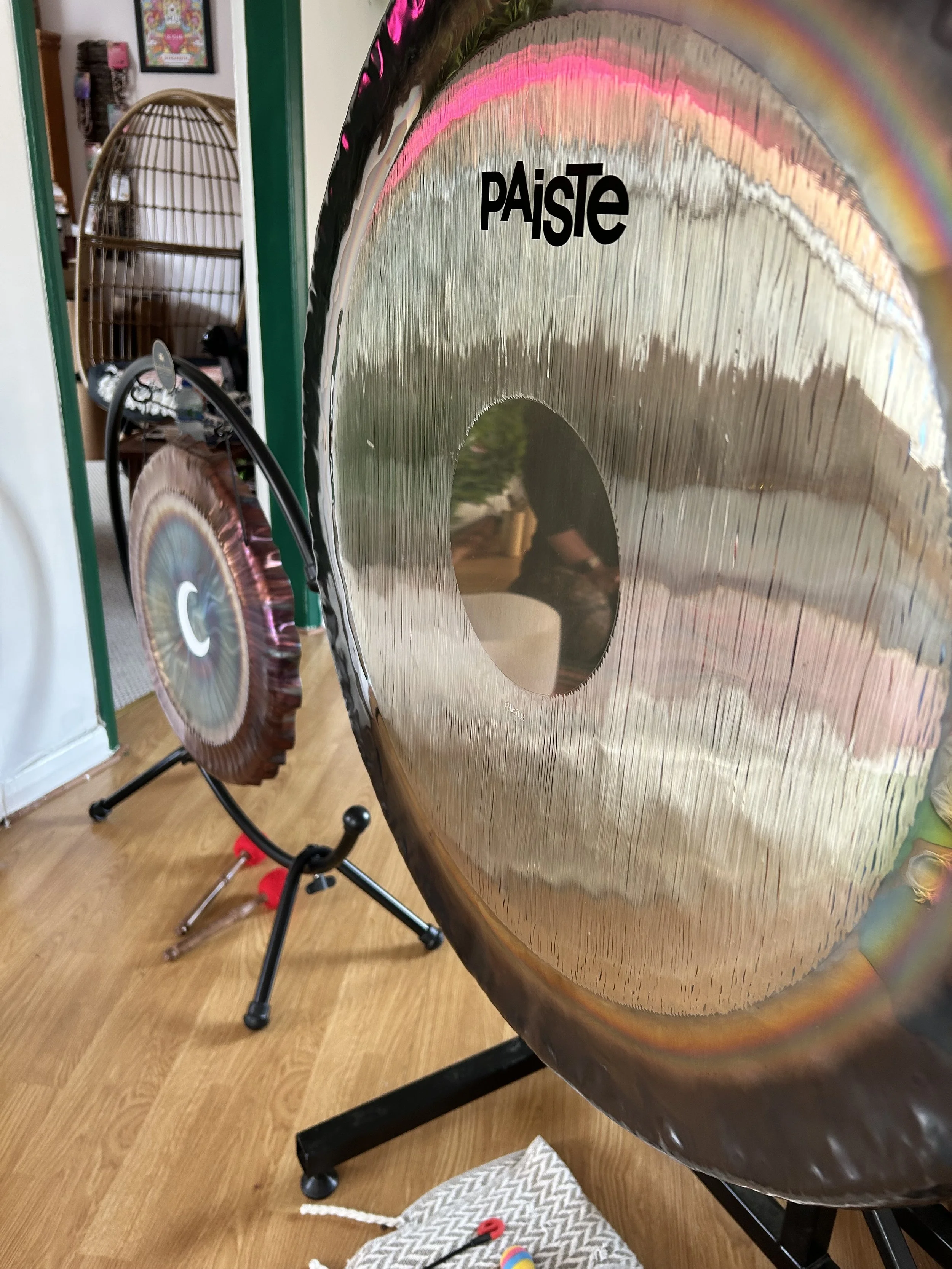 A Soundbath is a deeply immersive experience where you’re “bathed” in the vibrations of sound — usually from instruments like gongs, singing bowls, chimes, drums, and voice.